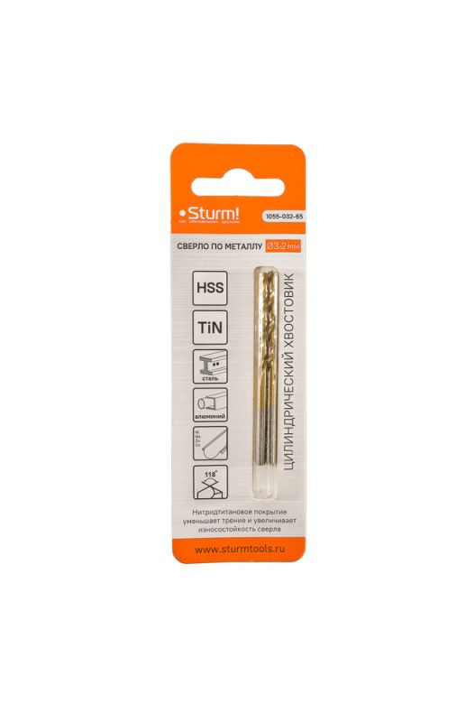 Сверло по металлу Sturm 3,2х65 мм, сталь HSS, нитридтитан., 118° ,блистер 2 шт, 1055-032-65