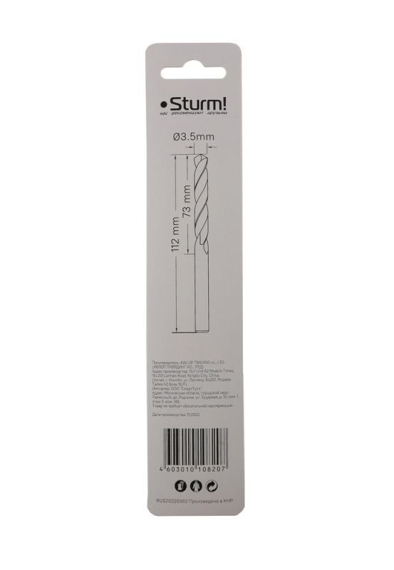 Сверло по металлу Sturm 3,5х112 мм, сталь HSS, удлинен., 118° ,блистер 2 шт, 1055-035-112L