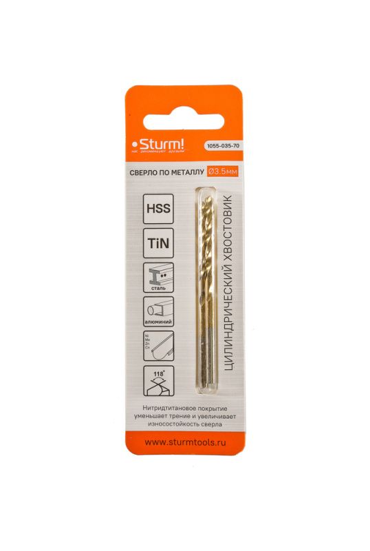 Сверло по металлу Sturm 3,5х70 мм, сталь HSS, нитридтитан., 118° ,блистер 2 шт, 1055-035-70