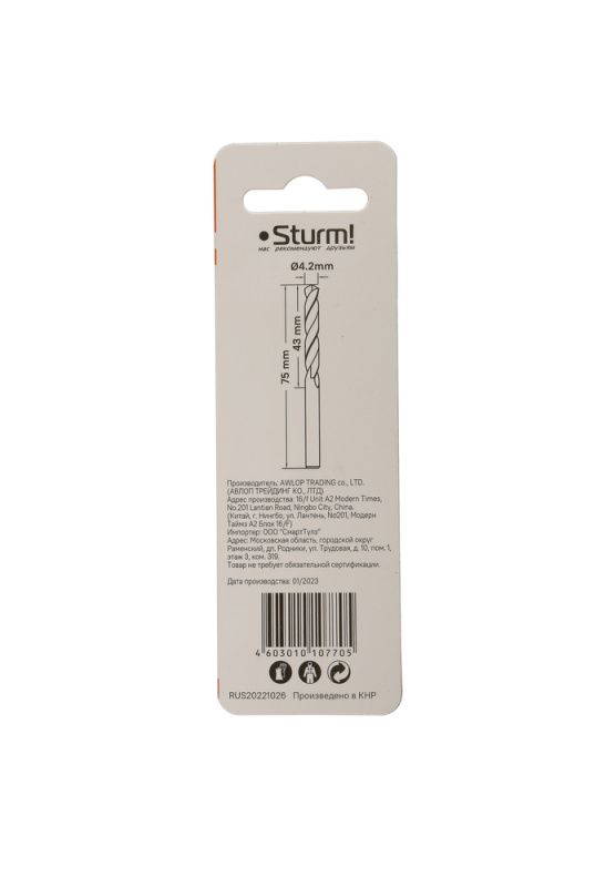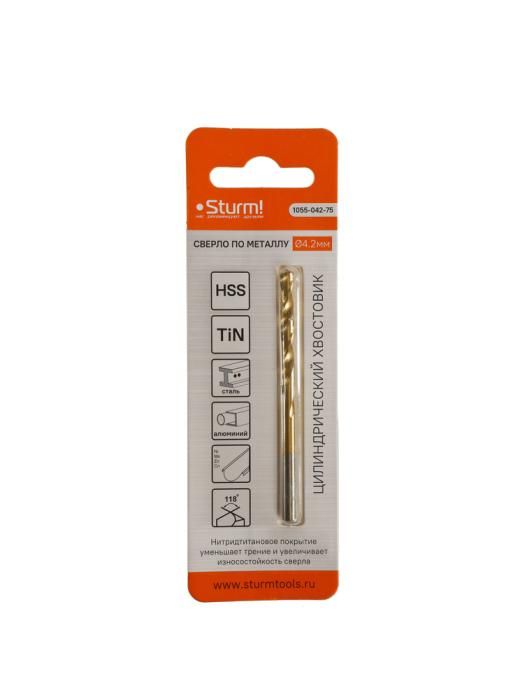 Сверло по металлу Sturm 4,2х75 мм, сталь HSS, нитридтитан., 118° ,блистер 1 шт, 1055-042-75