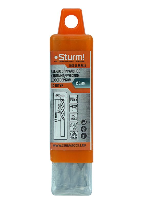 Сверло по металлу Sturm 5,0х86 мм, сталь HSS, упаковка 10 шт, 1055-04-5S-SS10