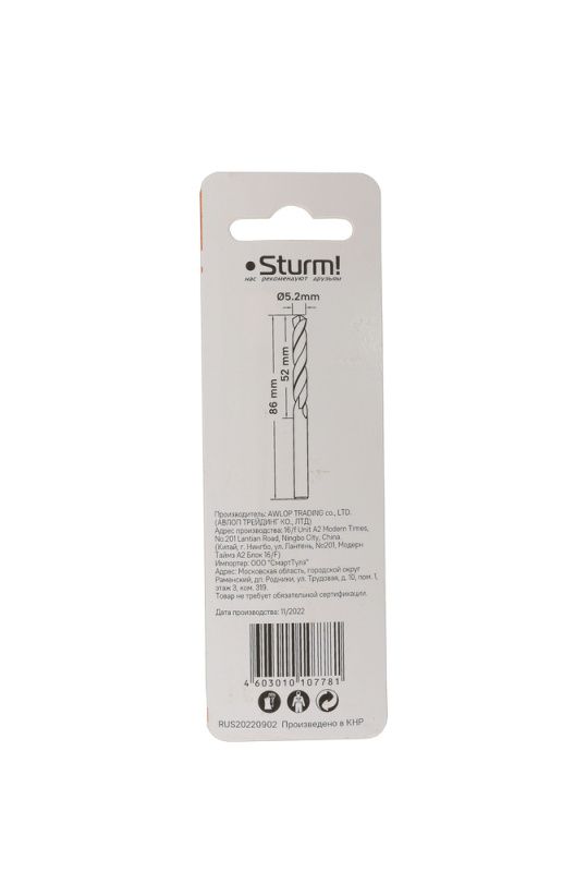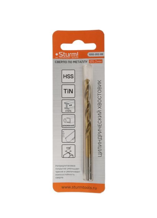 Сверло по металлу Sturm 5,2х86 мм, сталь HSS, нитридтитан., 118° ,блистер 1 шт, 1055-052-86