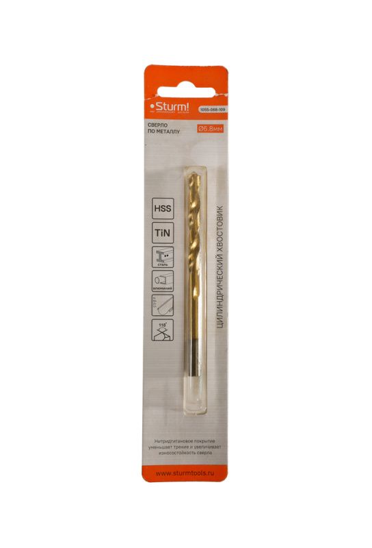 Сверло по металлу Sturm 6,8х109 мм, сталь HSS, нитридтитан., 118° ,блистер 1 шт, 1055-068-109