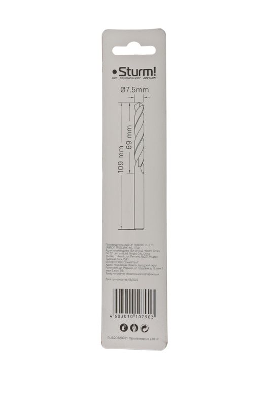 Сверло по металлу Sturm 7,5х109 мм, сталь HSS,нитридтитан., 118° ,блистер 1 шт, 1055-075-109