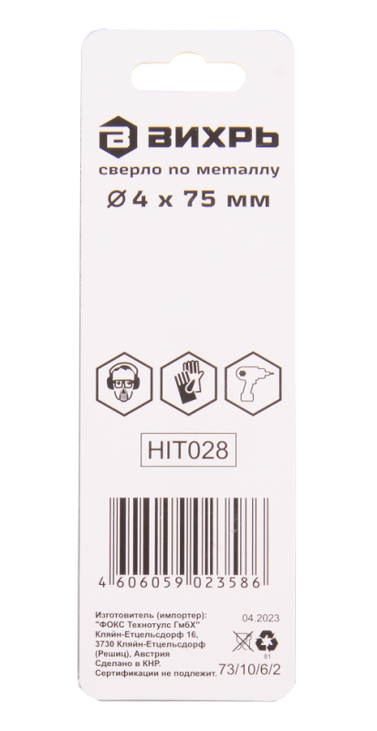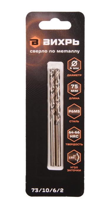 Сверло по металлу ВИХРЬ 4 мм, P6M5, 73/10/6/2