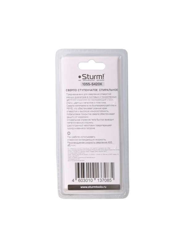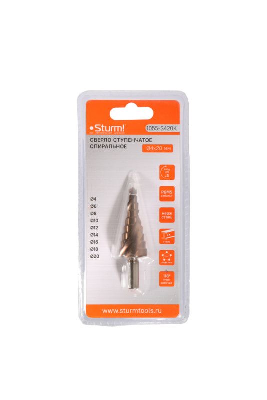 Сверло ступенчатое по металлу 4-20мм шаг 2мм Р6М5+COBALT спираль Sturm, 1055-S420K