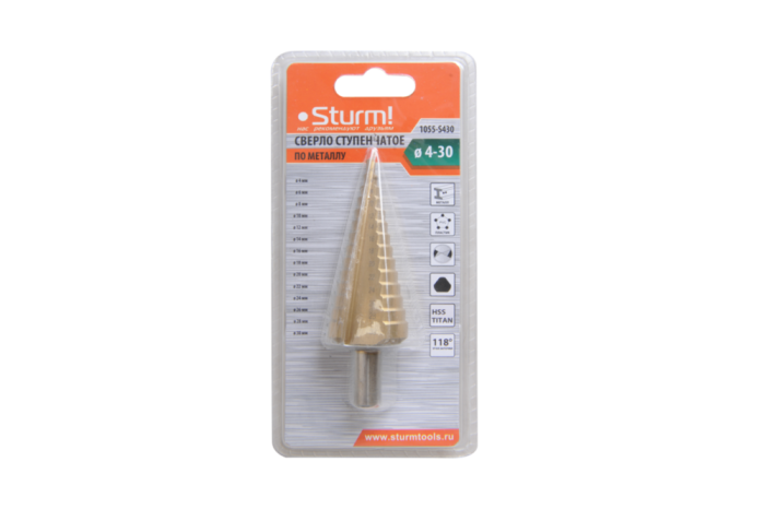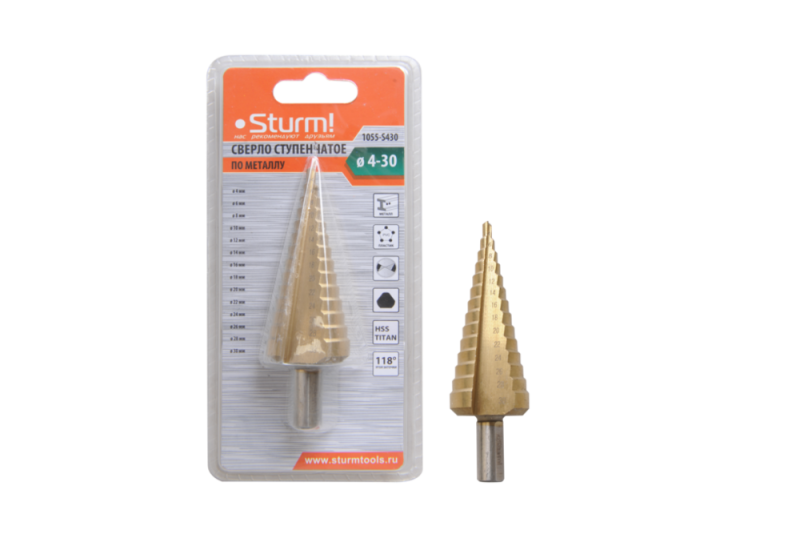 Сверло ступенчатое по металлу 4-30мм шаг 2мм HSS+TIN прямое Sturm, 1055-S430