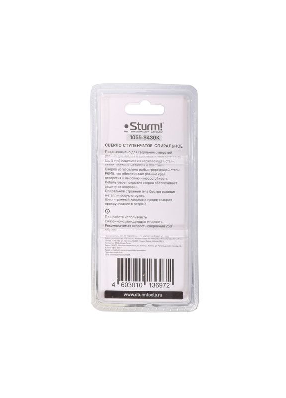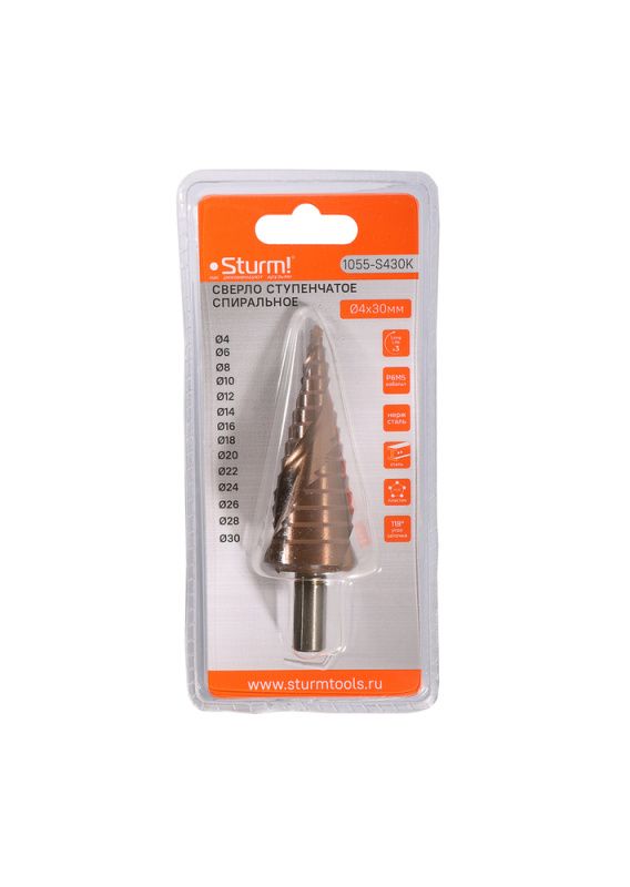 Сверло ступенчатое по металлу 4-30мм шаг 2мм Р6М5+COBALT спираль Sturm, 1055-S430K