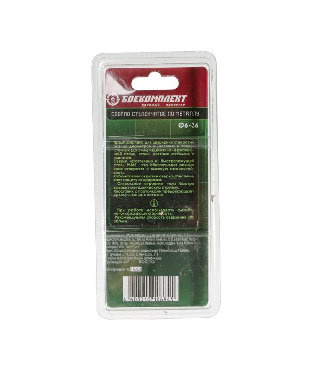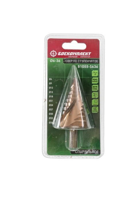 Сверло ступенчатое по металлу 6-36мм шаг 3мм Р6М5+COBALT спираль БОЕКОМПЛЕКТ, B1055-S636