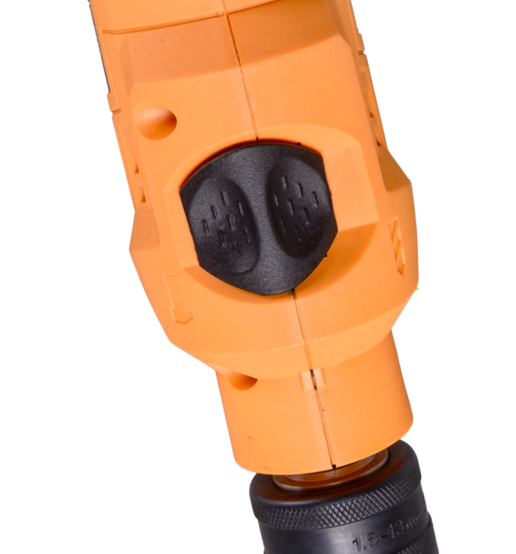 - Рукоятка имеет мягкую накладку и упор в нижней части для надежного захвата дрели во время работы.