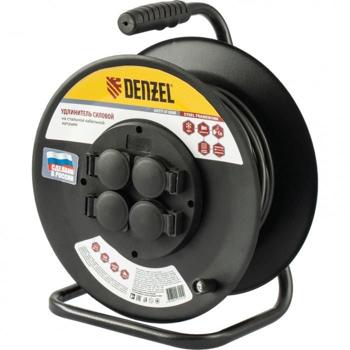 Удлинитель силовой на стальной катушке, ПВС 3 х 2.5 мм, 30 м, 4 розетки, 16 А, тип УХз-16 Denzel, 95984