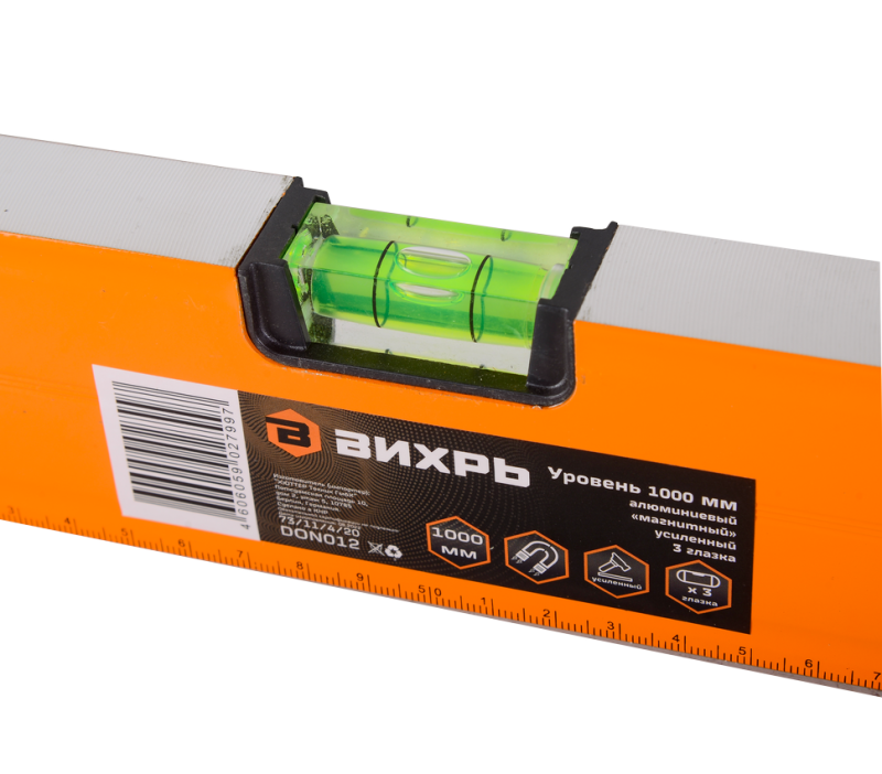 Уровень алюминиевый "Магнитный" 1000 мм, фрезерованный, 3 глазка (1 зеркальный) Вихрь - измерительный инструмент при строительных, ремонтных и отделочных работах для поиска и исправления отклонения поверхностей. Корпус прочный и износостойкий, изготовлен из алюминия. Фрезерованная рабочая поверхность служит для уменьшения возможной погрешности при измерениях. Длина уровня 1000 мм.Особенности: