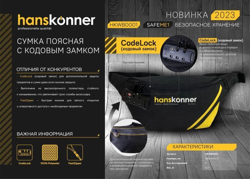 Сумка поясная, 2 отделения, 360x150x70мм, кодовый замок, Hanskonner, HKWB0001
