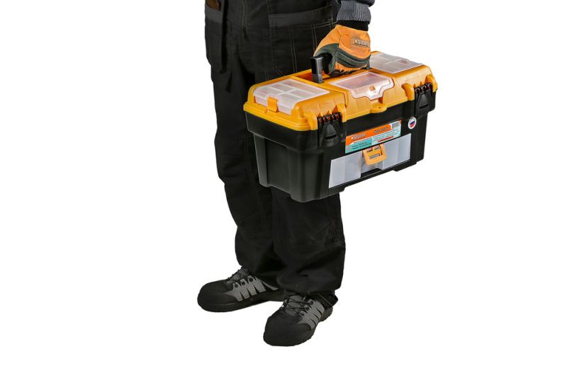 | Особенности | Ударопрочный пластик, Съемные органайзеры, Есть проушины для установки навесного замки или пломбы., Дополнтельный внутренний лоток, Прочность корпуса достаточна для использования ящика в качестве подставки как для выполнения работ, требующих опоры, так и для использования в качестве ступеньки при работах на уровне выше человеческого роста. 22 секции: 6 секций на внутренней вставке, 5 секций в консоли, 10 секций в двух коробках, 1 секция на крышке. |