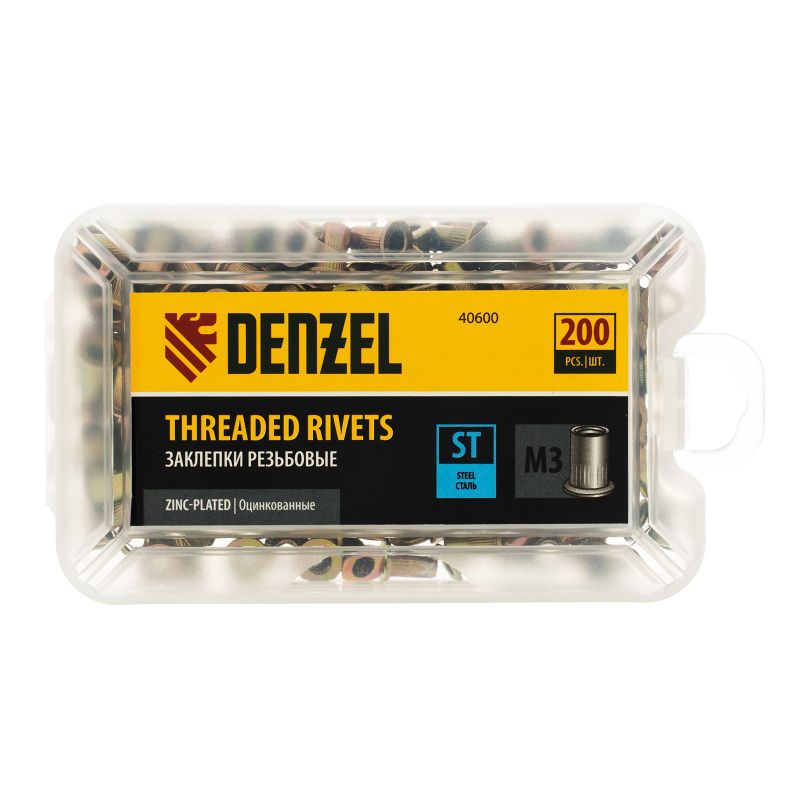Заклепки резьбовые, стальные, оцинкованные, М3, пластиковый кейс, 200 шт. Denzel, 40600