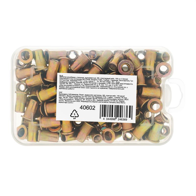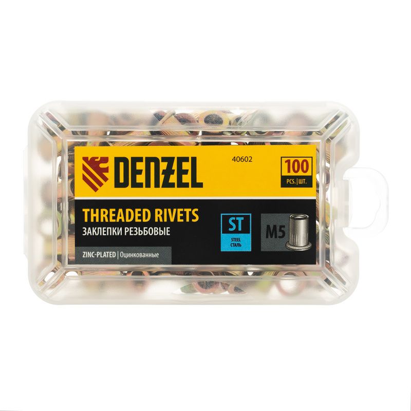 Заклепки резьбовые, стальные, оцинкованные, М5, пластиковый кейс, 100 шт. Denzel, 40602