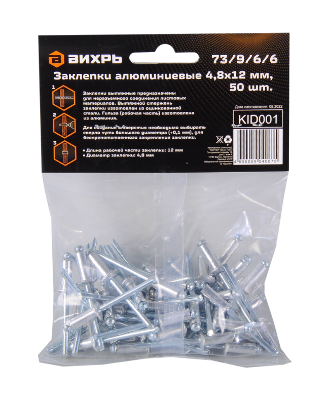 Заклёпки алюминиевые Вихрь 4,8х12 мм, 50 шт., 73/9/6/6
